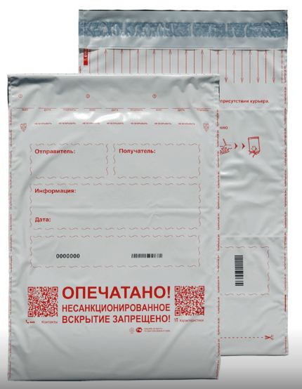 • Прозрачный карман для сопроводительных документов. • Специальные поля для записей ручкой или маркером. • Перфорация по всей длине клапана служит индикацией при попытке вскрытия. • Двойные боковые швы – надежная сохранность внутренних вложений. |